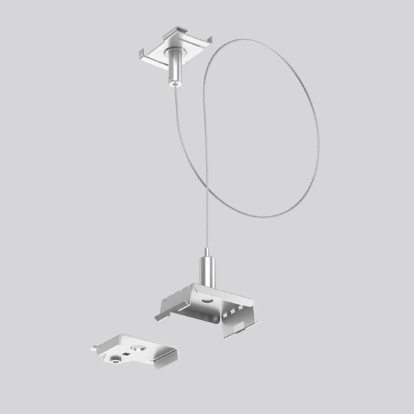 Pendelset für Rasterdecken mit Drahtseil 1500 mm und Caddyclip. Federstahl, blank, für Montage der LINEDO Lichtbandmodule.