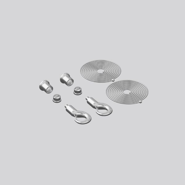Seilpendelset bestehend aus zwei Drahtseilen aus verzinktem Stahl (d = 1, 2 mm) mit Deckenbefestigung Gewinde M6 und Haken mit Seil-Schnellversteller mit Aushängesicherung.