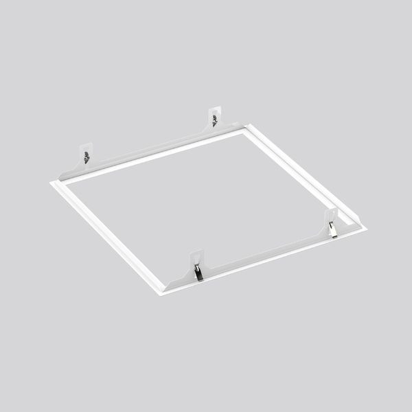 Einbaurahmen Stahlblech pulverbeschichtet, weiß. Zur Montage der Leuchte in abgehängte Decken. Werkzeugloser Einbau durch Federbefestigung. Einbautiefe mindestens 300 mm.