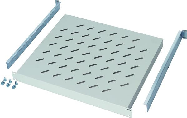 19“ Fachboden für den Festeinbau, mit passiver Belüftung, wird im Lochraster der vorderen und hinteren Ebene montiert.