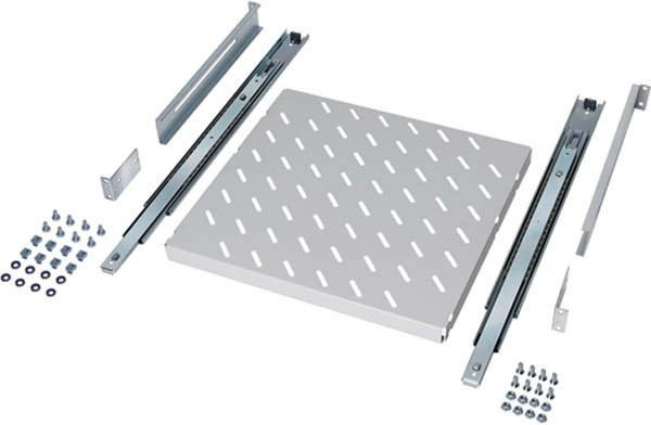 19'' Fachboden, ziehbar mit passiver Belüftung, wird im Lochraster der vorderen und hinteren Ebene montiert