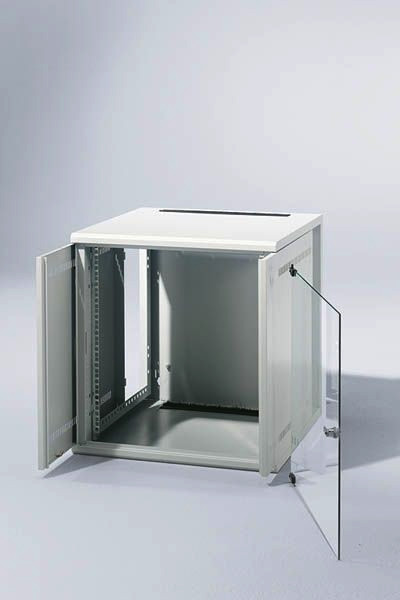 Hochwertige Stahlgehäuse (Lichtgrau RAL 7035) mit kompletter Grundausstattung, optimale Zugänglichkeit für schnelle Installation: Nach Aufschließen der Tür können Seitenwände einfach vorgezogen werden, Installationsfertig montiert mit Glas-Fronttür inkl. Schloss, mit 482,6 mm (19”) -Lochwinkeln vorne, Kabeleinführung durch Dach- und Bodenbereich und Kabelabfangschienen