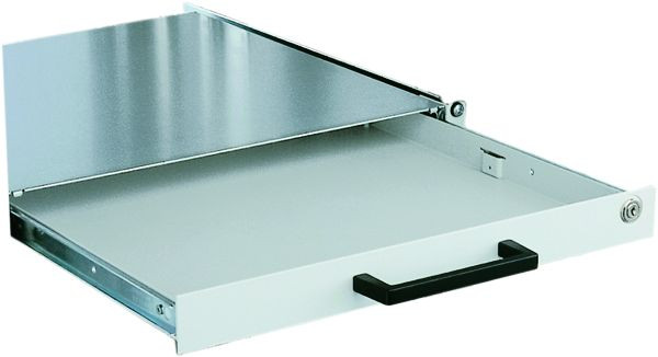 19"-Dokumentenschublade 1 HE, zur sicheren Aufbewahrung z. B. von Anlagendokumentationen, Manuals oder Werkzeugen, Teleskop-Teilauszug (ca. 75 %), rundum geschlossen, Abschließbarkeit, sichere Aufbewahrung wichtiger Dokumente, Dokumentenschublade kann in alle Racks mit zwei 482,6 mm (19")-Ebenen mit Lochrasterprofilen montiert werden, maximale Einschubtiefe 640 mm, Abmessungen (B x T x H): Außen: 482,6 mm (19") x 485 mm x 1 HE, Innen: 415 mm x 420 mm x 35, Belastbarkeit: 200 N, Stahlblech 1,25 mm, PulverlackierungRAL 7035 Lichtgrau, inkl. Befestigungsmaterial