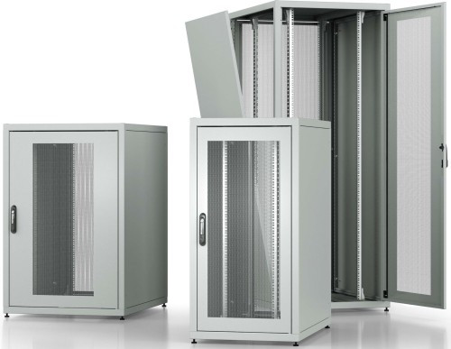 43HE mit perforierten Türen, Breite: 800 mm Höhe: 2.000 mm (43 HE) Tiefe: 1.000 mm Farbe: RAL 7035 Lichtgrau Schutzart: IP20 Belastbarkeit (statisch): 7.500 N Rahmenabstand vorne: 115 mm Ebenenabstand: 747 mm Türanschlag vorne / hinten: rechts / rechts. Ausstattung: 4 19" Lochwinkel mit HE Beschriftung, 1 Fronttür, 1tlg., passiv belüftet, 1 Rücktür, 1tlg., passiv belüftet, 2 Seitenwände, verschraubt, 1 Dach mit Kabeleinführung und Lüftervorbereitung, 1 Boden, offen, vorber. für seitl. Kabeleinführung, 4 Nivellierfüße, 1 zentraler Erdungspunkt