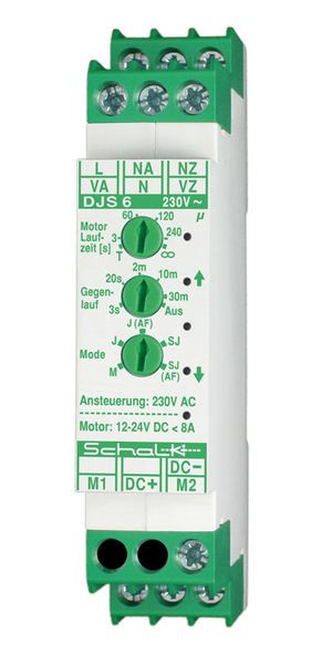 Das elektronische Steuergerät DJS 6 (230V AC, Reiheneinbaugerät) ist eine universell einsetzbare DC-Motorsteuerung für Recht-/Linkslauf, z.B. für Jalousien, Raffstoren, Sichtschutz-Jalousien, etc.. Diese Variante ist besonders geeignet bei Anlagenumrüstung von AC-Motoren auf DC-Motoren, da vorhandene 230V-Steuerleitungen weiterhin genutzt werden können. Ein- oder Zweitaster-Motorsteuerung möglich. Vorrangige Nebenstelleneingänge eignen sich, um mehrere DJS-Module zu Gruppen- und Zentralsteuerungen zusammenzufassen. Motorlaufzeit zeitlich begrenzbar (z.B. um bei mechanischer Blockade den Motor nicht zu überlasten). Exakte Verstellmöglichkeit der Lamellen bei Jalousiesteuerung (optional nach dem Abschalten automatisch auf einen bestimmten Winkel einstellbar). Der Modus SJ ermöglicht Jalousien motorschonend für Sichtschutzaufgaben zu betreiben. Einstellbare Auffächerfunktion zu Korrektur von Fehlausrichtung einzelner Lamellen. Maße: 18x55mm, 230V AC (Betriebs- und Steuerspannung), Motorausgang 12-24V DC (externe Einspeisung), 2 Schließer 8A