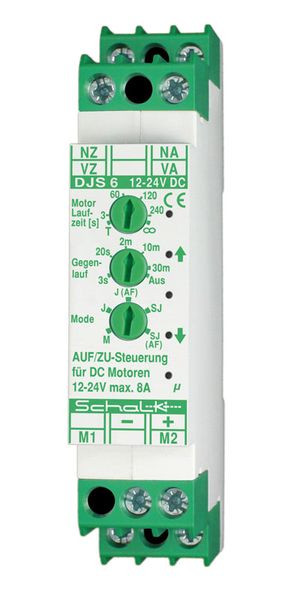 Das elektronische Steuergerät DJS 6 (Reiheneinbaugerät) ist eine universell einsetzbare DC-Motorsteuerung für Recht-/Linkslauf, z.B. für Jalousiene, Raffstoren, Sichtschutz-Jalousien, etc.. Es ist sowohl eine Ein- als auch eine Zweitaster-Motorsteuerung realisierbar. Durch die vorrangigen Nebenstelleneingänge ist es möglich, mehrere DJS-Module zu Gruppen- und Zentralsteuerungen zusammenzufassen. Die Motorlaufzeit kann zeitlich begrenzt werden um z.B. bei mechanischer Blockade den Motor nicht zu überlasten. Eine komfortable, automatische und einstellbare Schließfunktion verhindert u.a. ein unbeabsichtigtes Offenlassen eines Dachfensters. Bei Jalousiesteuerung können die Lamellen exakt verstellt, oder nach dem Abschalten automatisch auf einen bestimmten Winkel eingestellt werden. Bei der Option AF (Auffächern) werden die Lamellen nach längerem Zulauf einmal AUF und wieder ZU bewegt. Hierdurch wird eine bei bestimmten Jalousietypen evtl. auftretende Fehlausrichtung einzelner Lamellen korrigiert. In der Betriebsart SJ (Funktion: Sichtschutz Jalousie) erfolgt nach einem kurzen Tastendruck der Vororteingänge VA bzw. VZ die Verstellung der Jalousielamellen, z.B. vom senkrechten Winkel in den waagerechten Winkel (Sichtschutz an/aus). Maße: 18x55mm, 12-24V DC, 2 Schließer 8A