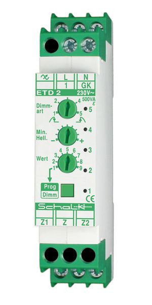 Mit dem elektronischen Universal-Tastdimmer ETD 2 lassen sich verschiedenste Leuchtmittel (LED-, Energiespar-, Glühlampen, NV-Halogenlampen mit Tronic- oder gewickelten Trafos, HV-Halogenlampen) dimmen. Neben einer automatischen Erkennung für gewickelte Trafos (Dimmart 'Auto') lässt sich bei Bedarf die Dimmart auch manuell auf Phasenan- oder Phasenabschnitt einstellen (evtl. notwendig bei Leuchtmitteln mit elektronischen Vorschaltgeräten). Eine spezielle ESL-Dimmart erzeugt zusätzlich eine Zünd- und Aufwärmphase für Kompaktleuchtstofflampen ('Energiesparlampen'). Der ETD 2 besitzt zwei zusätzliche potentialgetrennte Eingänge, die sich auch zur Gruppensteuerung eignen. Außerdem ist er auch direkt über eine Fronttaste bedienbar. Alle 3 Eingänge und die Fronttaste sind individuell programmierbar. Somit kann der Dimmer wahlweise mit nur 1 Taste geschaltet und gedimmt werden, oder aber mit 2 separaten Tasten. Des weiteren stehen auch reine Schaltfunktionen zur Verfügung. Außerdem können Memory, Schlummerfunktion, Laufzeit, Sanft-Ein-Rampe, Sanft-Aus-Rampe und Starthelligkeit vorgegeben werden., Maße: 18x55mm, 230V AC, 0-500W