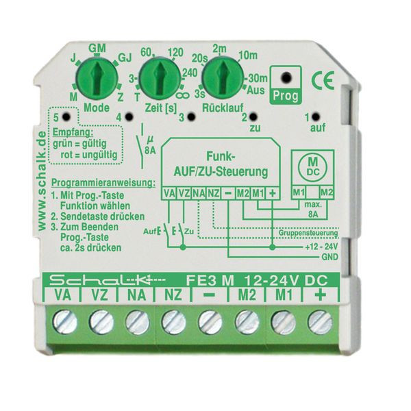 Zusammen mit den Sendern der FS3-Serie ist der Funkempfänger FE3 M eine universell einsetzbare (Funk-)Motorsteuerung, z.B. für Rollläden und Jalousien, Klappläden, Dachfenster, Rauchabzugshauben in Brandschutzanlagen, Torantriebe, Ventilsteuerungen usw. Es ist sowohl eine Ein- als auch eine Zweitaster-Motorsteuerung realisierbar. Durch die vorrangigen Nebenstelleneingänge ist es möglich, mehrere FE3 M zu Gruppen- und Zentralsteuerungen zusammenzufassen. Die Motorlaufzeit kann zeitlich begrenzt werden um z.B. bei mechanischer Blockade den Motor nicht zu überlasten. Eine komfortable, automatische und einstellbare Schließfunktion verhindert u.a. ein unbeabsichtigtes Offenlassen eines Dachfensters. Durch eine spezielle Jalousie-Betriebsart können die Lamellenwinkel exakt verstellt, oder nach dem Abschalten automatisch auf einen bestimmten Winkel rückgestellt werden. Durch die sehr kompakten Abmessungen von 43 x 43 x 18.5mm ist eine problemlose Installation in gängige Unterputz-Installationsdosen möglich.,Kompatible Produkte: Funksender FS3-Serie, Repeater FV2 R.,Lieferbar in den Varianten 230V AC (für Wechselstrommotoren) oder 12-24V DC (für Gleichstrommotoren), Maße: 43x43x18.5mm, 12-24V DC