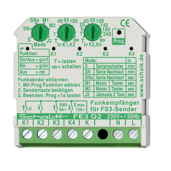 Der 4-Relais Funk-Empfängerschalter FE3 Q2 ermöglicht zusammen mit den Funksendern der FS3-Serie das drahtlose Schalten von elektrischen Betriebsmitteln (auch ohne Sichtverbindung), er ist als Serienschalter oder zur Motor- und Jalousiesteuerung einsetzbar. Das Gerät unterscheidet die Schaltfunktionen „Ein/Aus“ (abwechselnd Ein/Aus über eine Sendertaste = 1-Taster-Steuerung), sowie definiert „Ein“ und definiert „Aus“ (jeweils über separate Sendertaste = 2-Taster-Steuerung), Tastmodus (Relais schaltet nur solange Sendertaste gedrückt wird) oder Schaltmodus (mit/ohne einstellbarem Zeitablauf) möglich. 4 Relaiskontakte (Schließer 5A 250V AC, potentialfrei) (z.B. 4 Lampen oder 2 Motoren per Funk steuerbar), 6 Betriebsarten für: Serienschaltung, Kontaktzustandsübertragung, sowie Motor- und Jalousiesteuerung,
