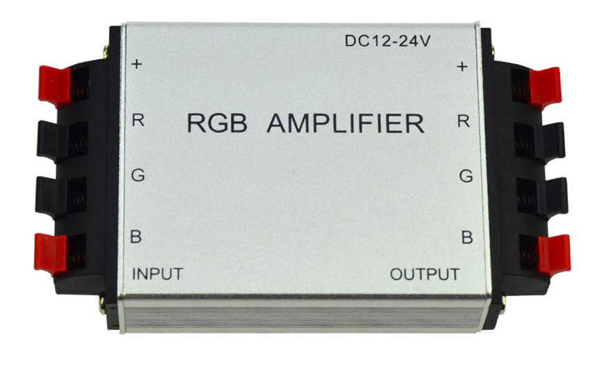 RGB-Verstärker für Lichtbänder Der RGB-Verstärker ist zu empfehlen, wenn man mehrere RGB LED Lichtbänder gemeinsam mit einem zentralen Controller steuern möchte. Er verstärkt das Steuersignal und sorgt für bessere Lichteffekte und Farbwechsel verbessert. Abgesehen von der zentralen Steuerung über Fernbedienung ist zu beachten, dass der Verstärker zum einwandfreien Betrieb an einen Stromkreis mit >12V Gleichstrom angeschlossen wird. (Stromverbrauch hängt von dem LED Lichtband ab, der mit dem Controller und dem Verstärker angeschlossen werden soll.)