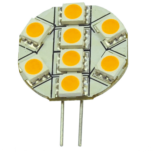 Kurzbeschreibung LED-Leuchtmittel 8xSMD Ø 25mm dimmbar G4 10-30 VDC 10-18 VAC 1,2W 135lm 3000K 125°