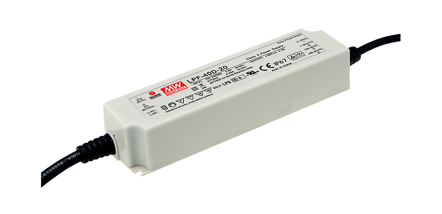 LED Schaltnetzteil 162,5x43x32mm Netzteil/ Transformator - In: 90~305VAC Out: 24VDC. Eigenschaften: Universaleingang, Überlastschutz durch Strombegrenzung, auto recovery, geschützt gegen Kurzschluss, Überlast, Überspannung, eingebauter PFC-Schaltkreis, IP67, für Innen- und Außenanwendungen, für LED- und Beleuchtungsanwendungen, UL1310 Class 2, fixierte Ausgangsspannung, Konstantstrom, EN61000-3-2, Class C, EN55015, EN61347-1, EN61347-2-13.