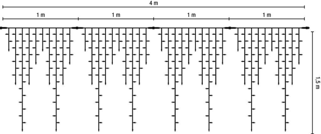 LED Giant Ice Lite Flash 240 4m 36V 8,8W Outdoor Das Hauptträgerkabel besteht aus 4 Segmenten, die je 1 m lang sind. Daran sind die ungleichmäßig langen Stränge im 90° Winkel fixiert, sodass eine Eiszapfenform entsteht. Mit Hilfe des patentierten Quick Fix Systems können mehrere Ketten problemlos aneinander gekoppelt werden. Die Energieversorgung der miteinander gekoppelten 36V Produkte erfolgt durch einen zentralen Trafo. Die Anzahl der zu koppelnden Eiszapfenvorhänge wird durch die Wahl des Trafos beeinflusst. Das Ice Lite lässt 240 patentierte LED-Lichtpunkte UND 16 Blitz-LED erstrahlen. Die Segmente in Eiszapfenform sind in der Länge 1,5 m lieferbar. Einzelne Stränge sind nicht austauschbar, die einzelnen Segmente aber problemlos ersetzbar., Ice Lites begeistern durch ihr ungleichmäßiges Erscheinungsbild, das einer Eiszapfenform ähnelt. Der Effekt ist locker, zart, verspielt und doch grazil, was den individuellen Charme optimal unterstreicht. Dieser Profi-Lichtervorhang eignet sich ideal für Giebel-, Balkon- sowie für Fassadendekorationen. Auch Eingänge, Fenster und Vordächer können funkelnd dekoriert werden. Energieeffizienzklasse: nicht kennzeichnungspflichtig