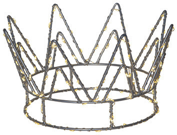 LED-Krone 22x12cm silber Krone mit umwickelter Tautropfen-Lichterkette mit warmweißen LED. Batteriebetrieb: 3 x AA (100h), nicht enthalten, mit Schalter on/off und Timerfunktion (6 h on / 18 h off, repeat), 50 cm langes, transparentes-50 cm-PVC-Kabel mit Batteriefach Energieeffizienzklasse: nicht kennzeichnungspflichtig Quecksilbergehalt (mg): 0