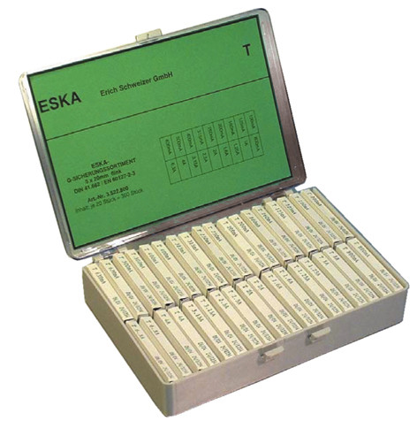 Sicherungssortiment 7 Sicherungssortiment 7 5x20mm flink mit 360 Feinsicherungen E3.520.800., Inhalt je 20 Stück:, 100mA, 125mA, 160mA, 200mA, 250mA, 315mA, 400mA, 500mA, 630mA, 800mA, 1A, 1,25A, 1,6A, 2A, 2,5A, 3,15A, 4A, 6,3A., Flinke G-Sicherungseinsätze werden zum Schutz solcher Geräte verwendet, bei denen beim Einschalten oder im Betrieb keine Stromstöße auftreten, aber hohe Über- oder Kurzschlussströme in kürzester Zeit unterbrochen werden sollen. Häufig werden in Netzkreisen diese Einsätze auch als vorgeschaltete Kurzschlusssicherung benutzt.