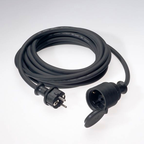 Schutzkontakt-Verlängerung H07RN-F 3 G 1,50 qmm mit Schuko-Zentralstecker u. Kupplung mit Deckel, 16 A/ 250 V, IP 44, Länge: 5 m., Farbe: schwarz