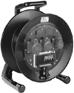 Robuster Kompaktwickelkörper aus einem homogenen Stück. Größer, kabelschonender Wickelkern, mit Feststellbremse, Schutzart IP 44. Mit 2 CEE-Dosen 5 x 16 A, 1 CEE-Dose 3 x 16 A und 2 SCHUKO-Dosen. Mit Thermoschutz nach VDE 0620. Zur Verwendung im Freien und auf Baustellen.