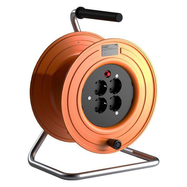 Kabeltrommel aus Stahlblech mit 4-fach Schutzkontakt-Steckdose 2-polig + E, 16A, 250V. Tragegriff aus verzinktem Stahlrohr mit isoliertem Handgriff. Ohne Kabel.