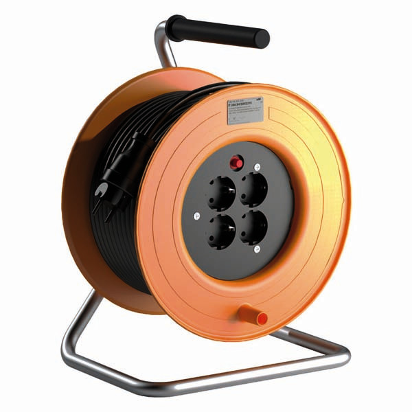 Kabeltrommel aus Kunststoff mit 4-fach Schutzkontakt-Steckdose 2-polig + E, 16A, 250V. Tragegriff aus verzinktem Stahlrohr mit isolriertem Handgriff. Mit 50 m Kabel H05RR-F 3G1,5