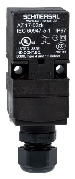 Gehäusegröße: 60 x 30 x 30 mm. Sicherheitsschalter mit getrenntem Betätiger Kunststoffgehäuse, kleine Bauform, Mehrfach-Codierung, hohe Lebensdauer, inklusive Pg 9 -Verschraubung, Schlitzverschluss im Lieferumfang, hohe Kontaktsicherheit bei niedrigen Strömen, verschmutzungsunempfindlich durch patentiertes Walzensystem, 8 Betätigungsebenen, Schneidklemmtechnik, mit seitlichem Leitungsausgang erhältlich. Schutzart IP 67, -30° bis +90° C, 4 A / 230 V. Gehäusegröße: 60 x 30 x 30 mm.