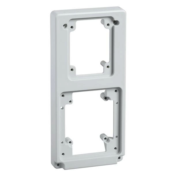 Adapterplatte für die Montage von 2 Steckdoesen in Kaedra-Gehäuse. Installation von Steckdosen, 1 Öffnung 65 x 85 mm für die Montage von Steckdosen Serie PK - 16 A 2P+ oder SCHUKO-Steckdosen und 1 Öffnung 90 x 100 mm für die Montage von Steckdosen Serie PK - 16 A 3P+N+ und 32 A. Gesamtmaße 103mm (B) x 225mm (H).