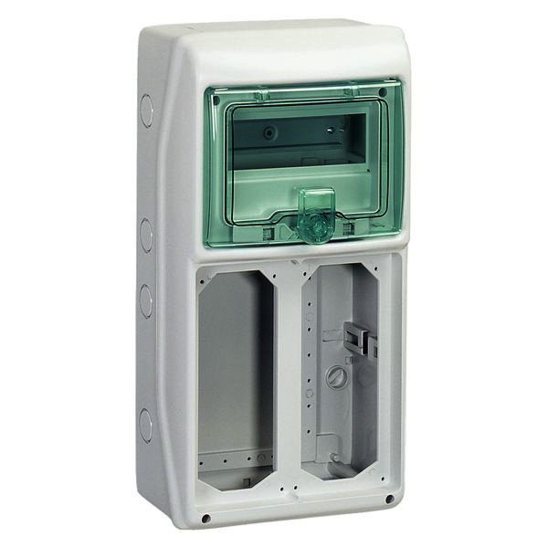 Kaedra wetterfestes Aufputzgehäuse mit der Möglichkeit von verschiedenen Einbauten, 2 Montagestellen für verriegelbare Steckdosen 103x225mm, 8 TE für Reiheneinbaugeräte. IP-Schutzklasse - IP65. Es können alle Arten von modularen Reiheneinbaugeräte installiert werden und es gibt Platz für die installation von Industriesteckdosen. Das Gehäuse ist mit einer transparenten grünen Tür für modulare Reiheneinbaugeräte ausgestattet. Die Farbe des Gehäuses ist hellgrau (RAL 7035). Es ist für die Neuinstallation oder Renovierung in Zweckgebäuden oder auch vielen anderen Bereichen z.B. Industrie vorgesehen. Die Kabel können über vorgestanzte Öffnungen an der Ober- oder Unterseite des Gehäuses eingeführt werden. 1 Klemmenblock wird mitgeliefert. Die Anschlussklemmen haben 8 Abgänge. Das Gehäuse hat die Schutzklasse II und ist bis zu einem Nennstrom von 63A zugelassen.