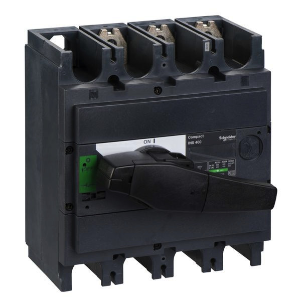 Compact INS400 ist ein 3-poliger, nicht selbsttätiger Lasttrennschalter 400A mit schwarzem Drehgriff.