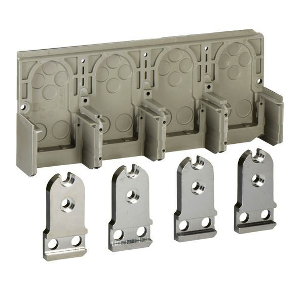 Bei diesem Zubehör handelt es sich um Frontanschlüsse für 4-polige feste ComPact NS Leistungsschalter und feste ComPact NS Lasttrennschalter. Sie können an die Leistungsschalter ComPact NS 630b/800/1000 mit dem Ausschaltvermögen N/H angebracht werden. Sie können auch an die Lasttrennschalter ComPact NS 630b/800/1000 NA angebracht werden. Diese Frontanschlüsse sind für die Montage von oben konzipiert. Sie sind mit unverlierbaren M10-Schrauben für den direkten Anschluss von Sammelschienen ausgestattet. Blanke Kabel und Kabel mit Kabelschuhen können mit weiterem Zubehör angebracht werden. Der Abstand beträgt 70 mm und die Klemmenbreite beträgt 44 mm. Sie werden als 4-teiliges Set verkauft.