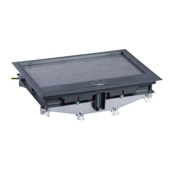 UFB700 Bodendose kunststoff 68x220x310 + Montagerahmen grau RAL7011: Halogenfreie rechteckige Bodenauslaßdose zweiteilig, geprüft nach VDE 0634 Teil 1. Die Auslaßdose ist zum Einbau in FrontLineâ-Eingießdosen vom Typ UFB-IG und in Doppelböden von 18mm ? 51mm Dicke geeignet. Es können bis zu 9 Steckdosenaulässe vom Typ CYBÔ realisiert werden. Der Deckel ist bis 3 kN belastbar und durch einfaches umstecken in vier Richtungen klappbar. Die Dose kann durch eine zusätzliche Deckelsicherung gegen unbefugten Zugriff fest verschlossen werden. Durch Kabelklammern und schaumstoffabgedichtete Klappen wird ein sauberer und sicherer Kabelauslaß gewährt.