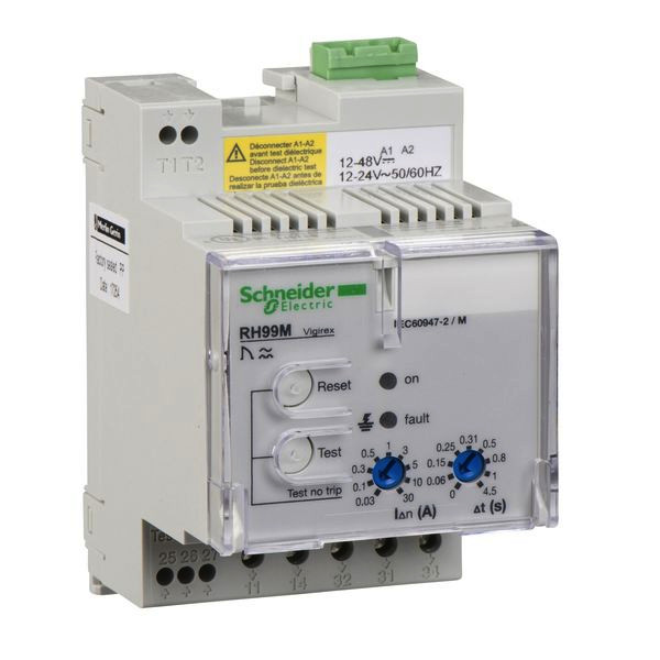VigiPacT RH99M ist ein Fehlerstromschutzrelais für die Montage auf DIN-Schienen. Er schützt vor direktem oder indirektem Kontakt mit Personen, Brandgefahren und Motoren. Er misst den Ableitstrom in einer elektrischen Anlage über seinen zugehörigen Ringkernwandler. Er löst den zugehörigen Leistungsschalter aus, wenn der eingestellte Fehlerstrom überschritten wird. Die Betriebsspannung beträgt 12/24VAC 50/60Hz, oder 12/48VDC. Die Stromempfindlichkeit ist mit 9 Schwellenwerten von 30 mA bis 30 A wählbar. Die Zeitverzögerung ist mit 9 Einstellungen von sofort bis 4,5s wählbar. Nach einer Fehlerbeseitigung ist ein lokaler manueller Reset erforderlich. Die überwachte Spannung des Verteilnetzes beträgt bis zu 1000 VAC 50/60/400 Hz. Er wird auf einer DIN-Schiene in einem Schaltschrank installiert und hat die Schutzart IP40. Er muss mit einem kompatiblen Schneider Electric Ringkern- oder Rechtecksensor vom Typ A verbunden sein.
