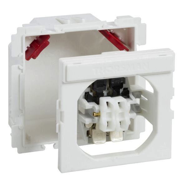 Jalousietaster 250V/16A Einsatz 1 polig mit Dose ohne Wippe Typ CYB-PB. Schalter-Zubehör-Kit mit Dose, Schaltereinsatz, Adapter und zwei Zugentlastungsvorrichtungen. Einschaltposition oben. 250 V, 16 A. Kombinierbar mit dem Frontabdeckungskit. Material PC/ABS, PA.
