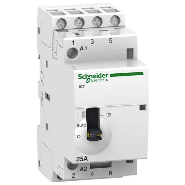 Installationsschütz Acti 9 iCT. Nennstrom 25A, 4S, Steuerspannung 24V, 50Hz, MO, Isolationsspannung (Ui) 500V AC. Schalten von Stromkreisen bis 100A. Klemmen IP 20. Geräuscharmes Schalten. Mechanische Schaltstellungsanzeige. Installationsschützen mit Vorwahl verfügen über einen frontseitigen Betriebsartenwahlschalter mit vier Schaltstellungen. Kompatibel mit der gesamten Produktreihe Acti 9. Der iCT Installationsschütz erfüllt folgende Normen- EN 61095 und IEC 1095. Des Weiteren ist diese Baureihe VDE zertifiziert!.
