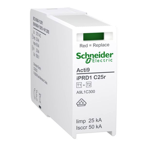Ersatzschutzmodul für Kombiableiter iPRD1 C25r 3P. geeignet für A9L1C325 (L-PE). Optische Funktions - / Defektanzeige des Ableiters (grün OK/ rot Gerät defekt). U0-Nennspannung 240 V AC (50/60Hz). Uc -höchste Dauerspannung 275V AC. In-Nennableitstossstrom 25 kA. Imax -maximaler Ableitstossstrom 65 kA. Iimp 25kA. Up-Schutzpegel 1,5 kV. Abmessung (B) 18mm x (H) 45mm x (T) 73.5mm. Gewicht 105g. Schutzart IP20 integriert. Betriebstemperatur -40 bis +85 Grad Celsius. Entspricht IEC 61643-11:2011, EN 61643-11:2012.