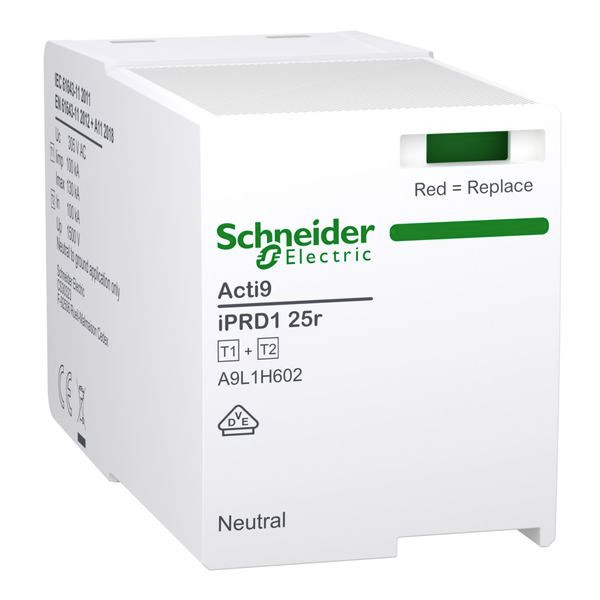 Ersatzschutzmodul für Kombiableiter iPRD1 25r 3P+N. geeignet für A9L1H625 (N-PE). Optische Statusanzeige des Ableiters (grün OK/ rot Gerät defekt). U0-Nennspannung 240 V AC (50/60Hz). Uc -höchste Dauerspannung 305V AC. In-Nennableitstossstrom 100 kA. Imax -maximaler Ableitstossstrom 130 kA. Iimp 100kA. Up-Schutzpegel 1,5 kV. Abmessung (B) 36mm x (H) 45mm x (T) 73.5mm. Gewicht 95g. Schutzart IP20 integriert. Betriebstemperatur -40 bis +85 Grad Celsius. Entspricht IEC 61643-11:2011, EN 61643-11:2012.