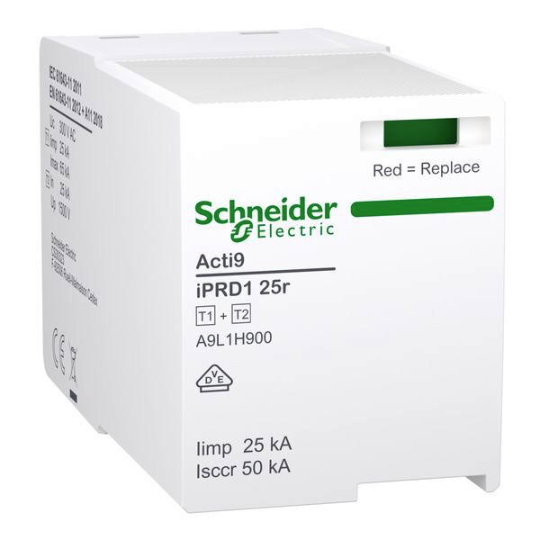 Ersatzschutzmodul für Kombiableiter iPRD1 25r 3P/3P+N. geeignet für A9L1H625 (L-N) und A9L1H325 (L-PE). Optische Statusanzeige des Ableiters (grün OK/ rot Gerät defekt). U0-Nennspannung 240 V AC (50/60Hz). Uc -höchste Dauerspannung 300 VAC. In-Nennableitstossstrom 25 kA. Imax -maximaler Ableitstossstrom 65 kA. Iimp 25kA. Up-Schutzpegel 1,5 kV. Abmessung (B) 36mm x (H) 45mm x (T) 73.5mm. Gewicht 165g. IP-Schutzart IP20 integriert. Betriebstemperatur -40 bis +85 Grad Celsius. Entspricht IEC 61643-11:2011, EN 61643-11:2012+A11:2018.