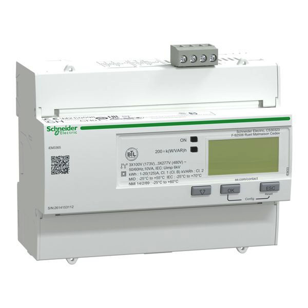 | Kurzbeschreibung | Energiezähler iEM3365, 3-phasig, 125A, erweiterte Messfunktion, BACnet, 1E/1A, MID konform, Genauigkeitsklasse 1 |