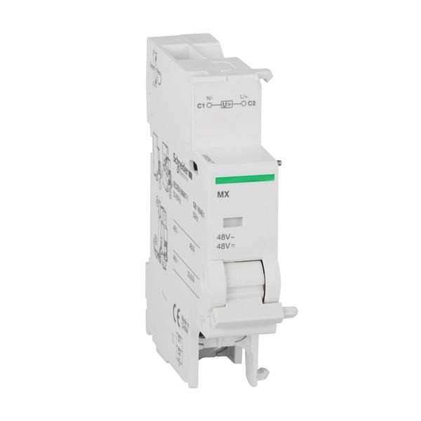 Arbeitsstromauslöser Acti 9 MX. Betriebsspannung (Ue) 48V AC / 48V DC. Löst das zugehörige Gerät aus, wenn der Arbeitsstromauslöser angesteuert wird. Not-Aus durch Schließer. Der MX Arbeitsstromauslöser erfüllt folgende Normen- IEC/EN 60947-1.