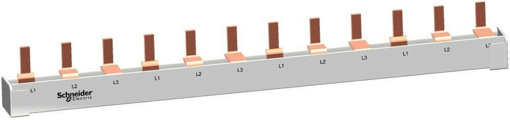 Phasenschiene Steg Acti 9. 3-polig, ablängbar, 11TE, Nennstrom 100A, Nennspannung 415V AC, Isolationsspannung (Ui) 500V. Farbton RAL 7016. Die Phasenschiene Steg erfüllt folgende Normen- IEC 60947-7-1 und IEC 61439-2.