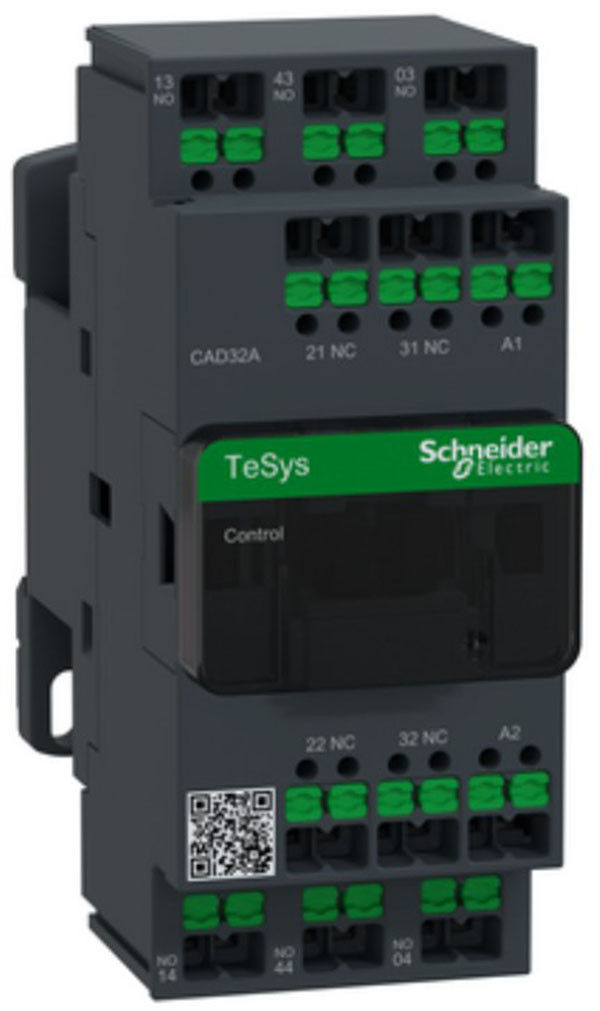 Hilfsschütze TeSys Control CAD. Hilfsschütz für die Gebrauchskategorien AC-15 bis 690V und DC-13 bis 440V. Es bietet 5 Kontakte (3S + 2Ö), eine 230 V 50/60Hz AC Spule. Für anspruchsvolle Anwendungen mit hohen Betriebsgeschwindigkeiten bis zu 10800 Zyklen/Stunde sorgt er für hohe Zuverlässigkeit und Haltbarkeit. Fünf integrierte Hilfskontakte, erweiterbar um bis zu neun Hilfskontakte. Schnelle, sichere und wartungsfreie Stromverbindung mit SnapIN Anschlussklemme. Geeignet für Sicherheitsanwendungen durch mechanisch gekoppelte Kontakte und Spiegelkontakte.