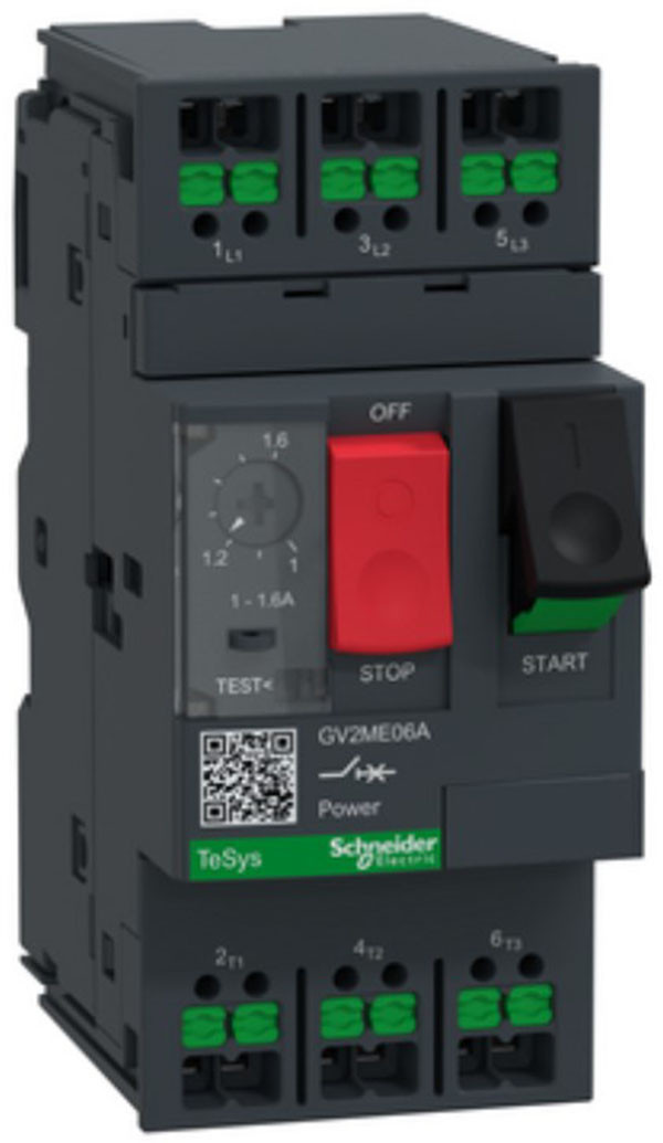 TeSys Power Motorschutzschalter. Motorschutzschalter, 3P. Bemessungsleistung 0,37 kW, Einstellbereich 1-1,6 A. Mit thermischen und magnetischen Auslösern. In der Grundausführung plombierbar und abschließbar. Betätigung über Taster. Bemessungsspannung 400 V, nach AC-3. Schnelle, sichere und wartungsfreie Stromverbindung mit SnapIN Anschlussklemme. Geeignet für Sicherheitsanwendungen durch mechanisch gekoppelte Kontakte und Spiegelkontakte.