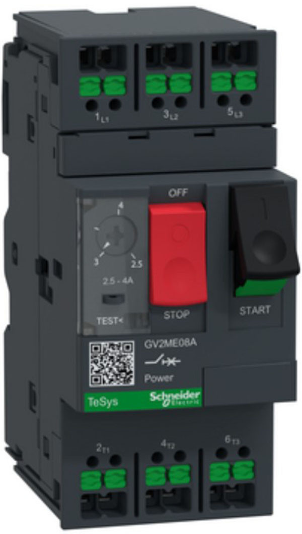 TeSys Power Motorschutzschalter. Motorschutzschalter, 3P. Bemessungsleistung 1,5 kW, Einstellbereich 2,5-4 A. Mit thermischen und magnetischen Auslösern. In der Grundausführung plombierbar und abschließbar. Betätigung über Taster. Bemessungsspannung 400 V, nach AC-3. Schnelle, sichere und wartungsfreie Stromverbindung mit SnapIN Anschlussklemme. Geeignet für Sicherheitsanwendungen durch mechanisch gekoppelte Kontakte und Spiegelkontakte.