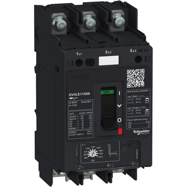 Motorschutzschalter TeSys GV4 mit thermischer Auslösung bis 115A Nennstrombelastung. Diese Geräte sind einfach zu bedienen und einzurichten, mit kompakter und ergonomischer Bauweise und für höchste Anforderungen bis 50kA im Bereich der Niederspannungsschaltgeräte. Ausgestattet mit einem Kipphebel zur einfachen Bedienung und der Anschlußmöglichkeit von Kabelschuhen oder Flachbändern.