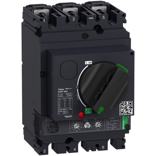TeSys GV Motorschutzschalter, 3 Pole (3P), 150A/690V, für den Schutz von 3-Phasen-Motoren 55-75kW@400V. Er bietet thermischen Magnetschutz und zusätzliche Schutzfunktionen, Ausschaltvermögen Icu 70kA, Start-Stopp-Steuerung durch Drehgriff. Weiterhin bietet er auch Anschluss für Stangen oder Kabel mit Kabelschuhen (direkter Anschluss von Kabeln mit zusätzlichen Steckern). Thermischer Schutz einstellbar über Einstellräder mit einem Einstellstrom Ir im Bereich 70-150A und einer wählbaren Auslöseklasse 5, 10 oder 20, Magnetschutz bei 15 In. Zusätzliche Schutzfunktionen mit festem Abgriff sind Kurzzeitverzögerungsschutz Isd bei 13 Ir, Phasenunsymmetrie und Ausfallschutz. Es stellt interne Plätze für zusätzliche Hilfskontaktblöcke (OF, SD) und Spannungsauslöser (MN, MX) zur Verfügung. Zertifiziert nach mehreren Normen (IEC, UL, CSA, CCC, EAC, Marine), Green Premium-konform (RoHS/REACh).