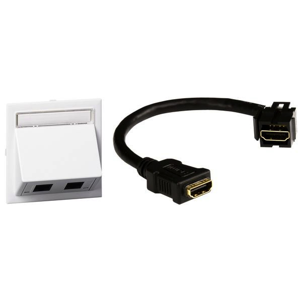 Multimedia Kit HDMI Kabel und Abdeckung schräg ws RAL 9016 Typ CYB-KIT HDMI. Multimedia-Kits mit F80-Montagerahmen, Etikettenfenster mit Etikett, abgeschrägter Abdeckung, Befestigungsblech.