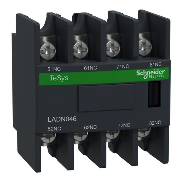 TeSys D unverzögerter Hilfskontaktblock, für Schütze LC1D, LC1F. Es verfügt über 4 Öffnerkontakte (NC mirror certified) mit einer Stromstärke von bis zu 10A 690V AC, Anschluss über Ringkabelschuhe und Schraubklemmen. Clip-on-Frontmontage, sie sorgt für hohe Zuverlässigkeit und Haltbarkeit. Nach mehreren Normen zertifiziert (IEC, UL, CSA, CCC), Green Premium-konform (RoHS/REACh).