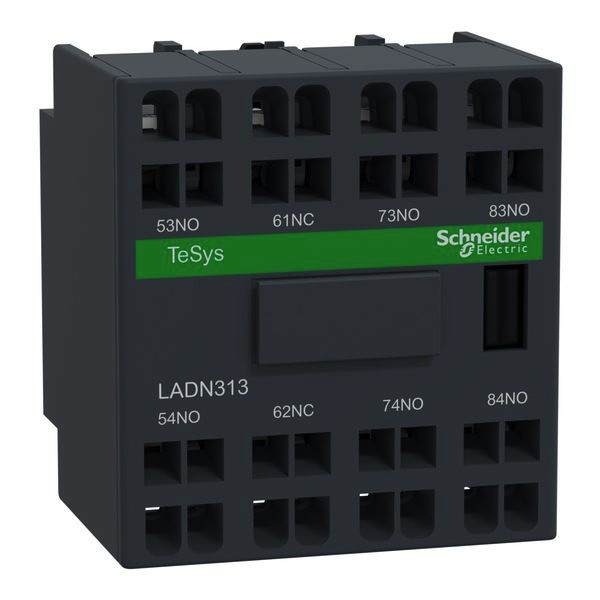 Unverzögerter Hilfsschalterblock für Schütze TeSys D. Es bietet 3 NO+1 NC-Kontakte mit einer Nennspannung von bis zu 10 A, 690 V AC, Anschluss über Federzugklemmen. Einfache Aufsteckmontage an der Vorderseite, für hohe Zuverlässigkeit und Haltbarkeit. Es verfügt über mehrere Normen (IEC, UL, CSA, CCC) sowie über eine Green Premium-Konformität (RoHs/Reach).