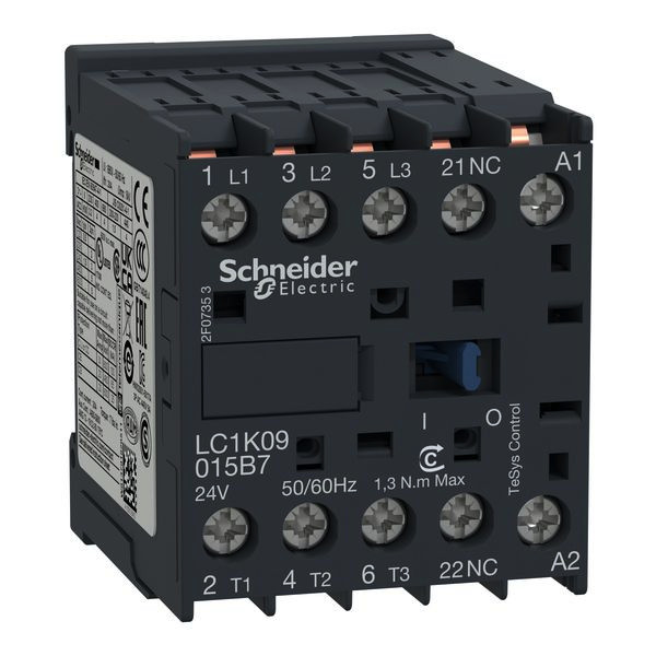 Leistungsschütz TeSys LC1K. 3 polig, 3 Schließer. Zusätzliche Hilfskontakte- 1 Öffner, Bemessungsbetriebsleistung bei AC-3, 400 V 2.2 kW, Bemessungsbetriebsstrom Ie bei AC-3, 400 V 6 A, Spule 24 V AC. Abmessung (BxHxT) 45x58x57 mm, Gewicht 0,18 kg. Kategorie AC-4, AC-3. Einfache Maschinensteuerung in Industrie, Infrastruktur und Gebäudeanwendungen. Einfach zu bedienende Schnittstelle für elektronische Geräte (SPS). Zertifizierungen nach UL, CSA. Produktstandards gem.