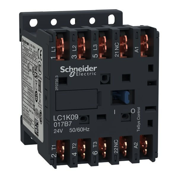 Leistungsschütz TeSys LC1K. 3 polig, 3 Schließer. Zusätzliche Hilfskontakte- 1 Öffner, Bemessungsbetriebsleistung bei AC-3, 400 V 4 kW, Bemessungsbetriebsstrom Ie bei AC-3, 400 V 9 A, Spule 24 V AC. Abmessung (T) 57 mm, Gewicht 0,18 kg. Kategorie AC-1, AC-4, AC-3. Einfache Maschinensteuerung in Industrie, Infrastruktur und Gebäudeanwendungen. Einfach zu bedienende Schnittstelle für elektronische Geräte (SPS). Zertifizierungen nach UL, CSA. Produktstandards gem.