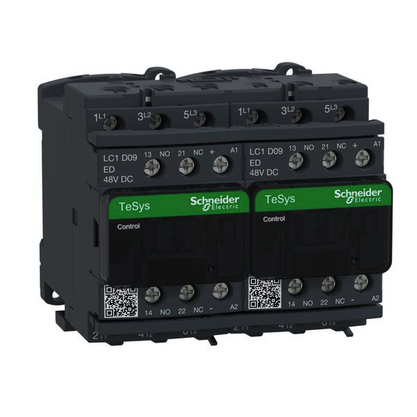 3-poliges Wendeschütz TeSys D für Motoranwendungen. Nennwert 9A AC-3 4kW@400V, beinhaltet eine 48V DC-Spule, 2 Öffner+2 Schließer Hilfskontakte, eine mechanische Verriegelung.