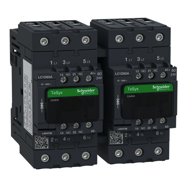 3-poliges Wendeschütz TeSys D für Motoranwendungen. Nennwert 65A AC-3 30kW@400V, beinhaltet eine 24V DC-Spule, 2 Öffner+2 Schließer Hilfskontakte, eine mechanische Verriegelung.